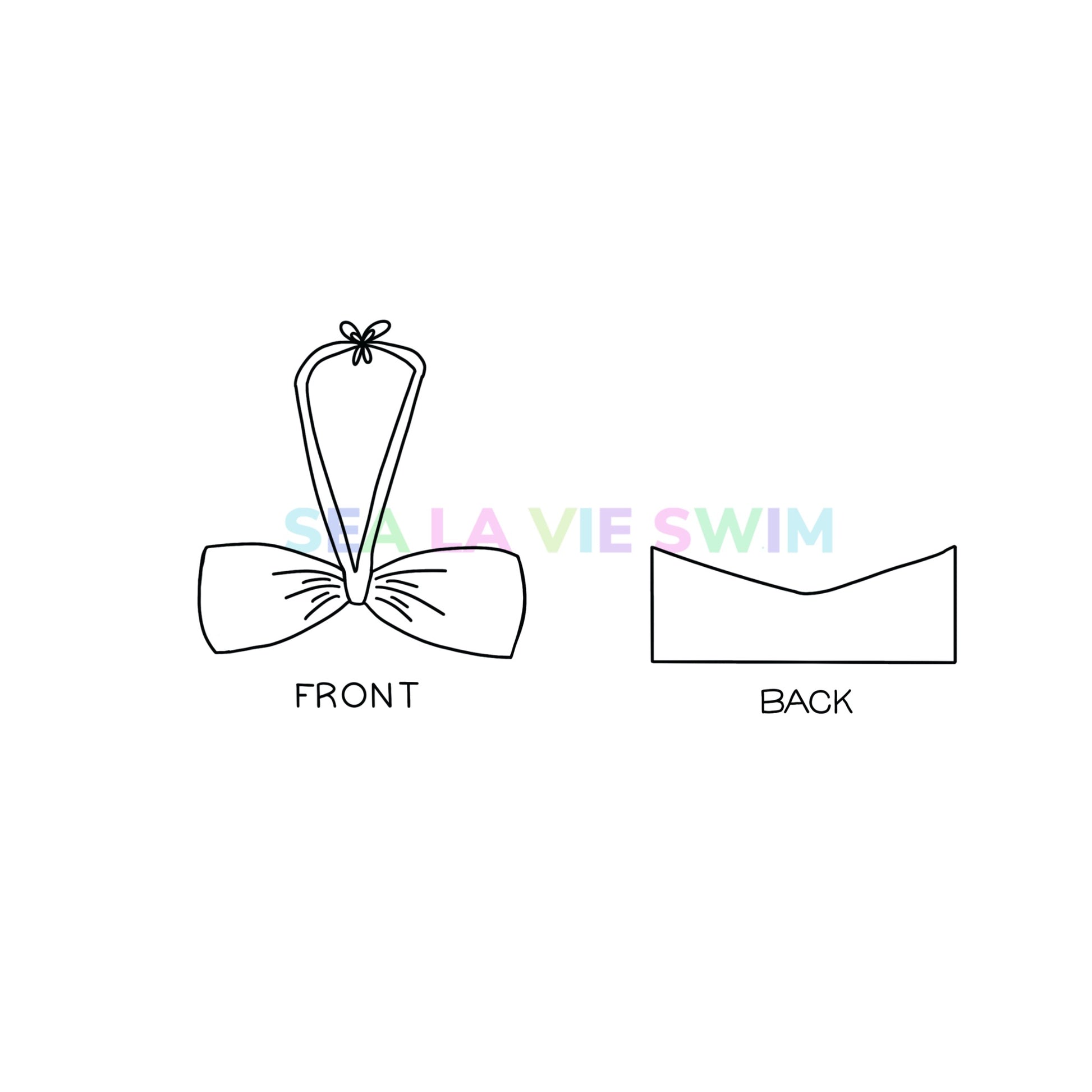 The Leahy Top is a bandeau top with a removable tie that can be worn around the neck. This top can be worn eight ways. Lighter fabrics could be see through. Custom bikinis can not be returned or exchanged, they are final sale. If you need help with sizing visit our Size Chart.