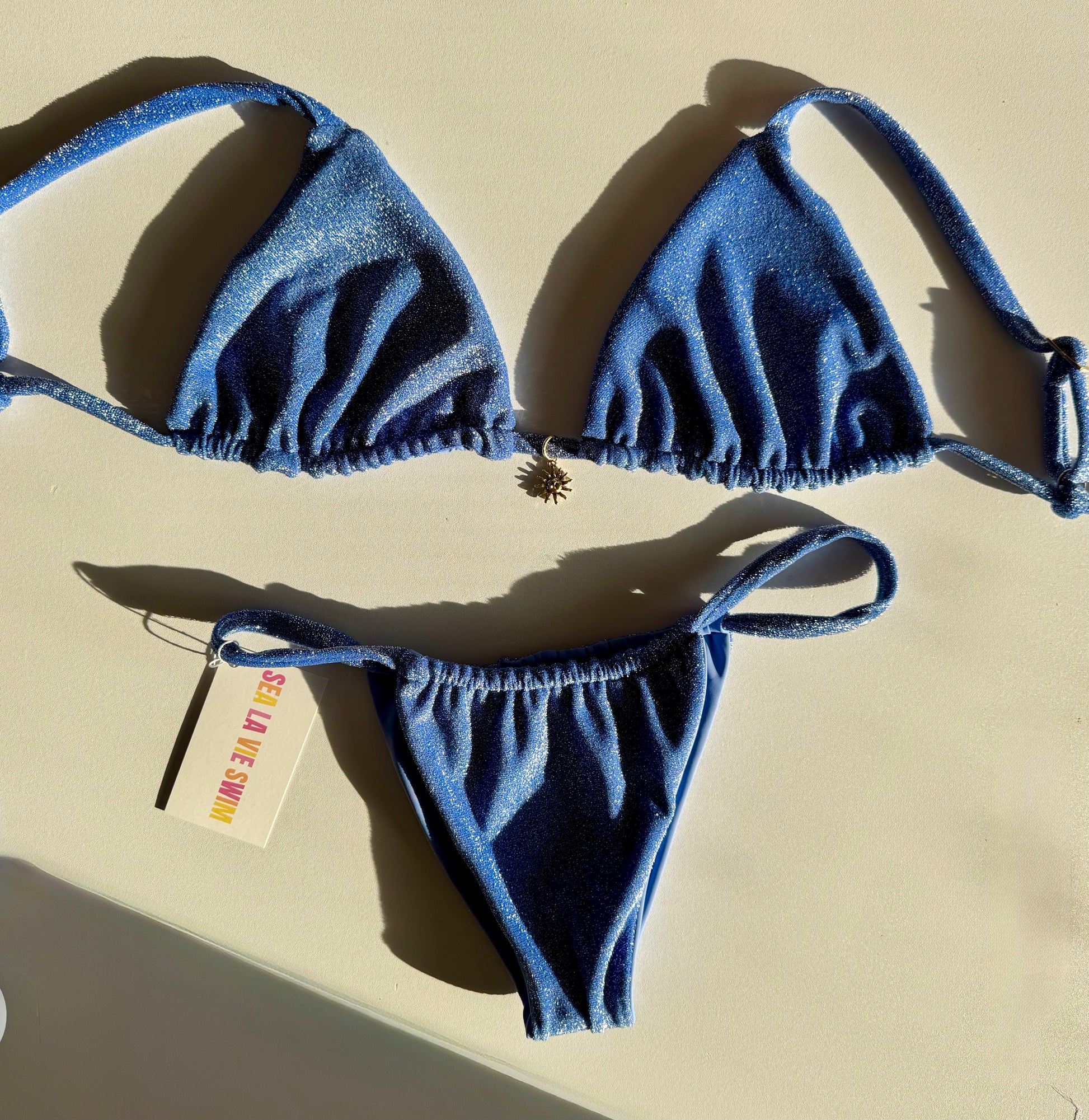 The Tahiti top takes a twist on your traditional triangle top with adjustable, stationary straps. Since this top has adjustable straps, please only choose one fabric. Lighter fabrics could be see through. Custom bikinis can not be returned or exchanged, they are final sale. If you need help with sizing visit our Size Chart.